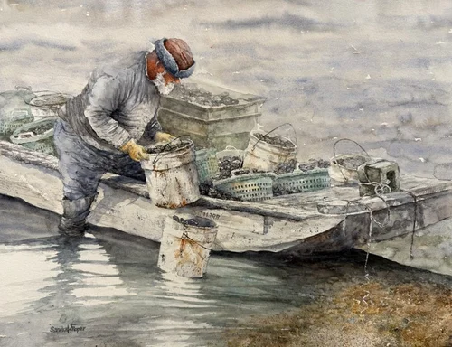 Weathered hands caked in mud lift the heavy buckets of freshly caught oysters into the timeworn boat. The old harvester, marked by years of tide and toil, works with continue passion for his love of the seaman's life. Painted in muted colors to represent the earthy season of life shaped by salt and sea. Original is available - framed size 32” x 28”. Giclee Prints available. Add to your Collection.